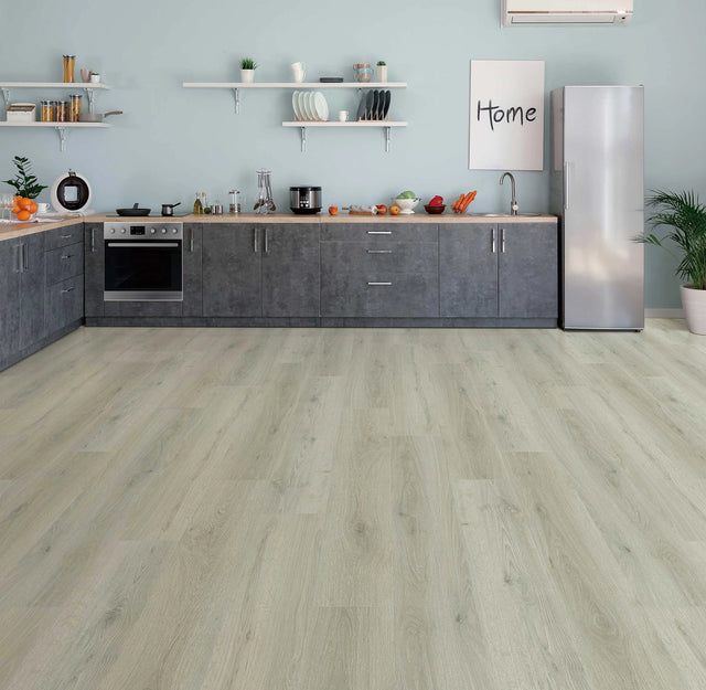 Enhance your interior space with this laminate flooring. The embossed texture, matte surface finish and beveled edges give it a wood look. Great for bedrooms, living room and kitchens, it features a soundproof, 2-mm pre-attached underlayment. A 100% waterproof HDF core offers scratch resistance for lasting use. Patented click-lock technology allows easy assembly.